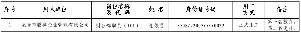 根據(jù)2024年1月26日發(fā)布的《關(guān)于龍巖市龍騰國有資產(chǎn)經(jīng)營發(fā)展有限公司所屬企業(yè)公開招聘工作人員的公告》有關(guān)要求,經(jīng)報名、資格審查、組織考試、體檢、考察等程序,現(xiàn)將龍巖市騰祥企業(yè)管理有限公司財務(wù)部職員(崗位代碼101)擬錄用人員名單公示如下: