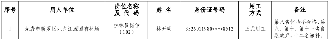 根據(jù)2024年3月19日發(fā)布的《龍巖市新羅區(qū)九龍江源國有林場(chǎng)關(guān)于公開招聘工作人員的公告》有關(guān)要求,經(jīng)報(bào)名、資格審查、組織考試、體檢、考察等程序,現(xiàn)將龍巖市新羅區(qū)九龍江源國有林場(chǎng)護(hù)林員崗位(崗位代碼102)擬錄用人員名單公示如下: