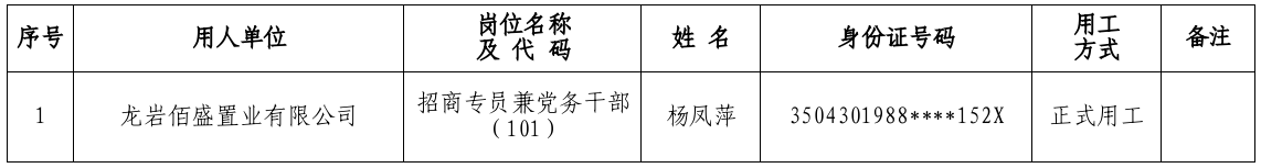 根據(jù)2024年8月30日發(fā)布的《龍巖投資發(fā)展集團(tuán)有限公司所屬企業(yè)關(guān)于公開招聘工作人員的公告》有關(guān)要求,經(jīng)報(bào)名、資格審查、組織考試、體檢、考察等程序,現(xiàn)將龍巖佰盛置業(yè)有限公司招商專員兼黨務(wù)干部(崗位代碼101)崗位擬錄用人員名單公示如下: