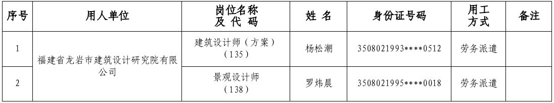 根據(jù)8月15日發(fā)布的《2024年龍巖人才活動(dòng)周市屬?lài)?guó)企優(yōu)質(zhì)崗位引進(jìn)人才招聘公告》及2024年9月7日發(fā)布的《2024年龍巖人才活動(dòng)周市屬?lài)?guó)企優(yōu)質(zhì)崗位引進(jìn)人才招聘公告部分崗位延期報(bào)名的補(bǔ)充公告》有關(guān)要求,經(jīng)報(bào)名、資格審查、組織考試、體檢、考察等程序,現(xiàn)將福建省龍巖市建筑設(shè)計(jì)研究院有限公司建筑設(shè)計(jì)師(方案)(崗位代碼135)等2個(gè)崗位擬錄用人員名單公示如下: