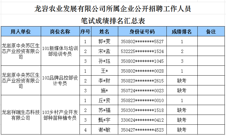 根據(jù)2024年12月20日發(fā)布的《龍巖農(nóng)業(yè)發(fā)展有限公司及所屬企業(yè)關(guān)于公開招聘(遴選)工作人員的公告》有關(guān)要求,現(xiàn)將龍巖原中央蘇區(qū)生態(tài)產(chǎn)業(yè)投資有限公司新媒體與培訓(xùn)部培訓(xùn)專員(崗位代碼101)等3個崗位筆試成績排名予以公示。