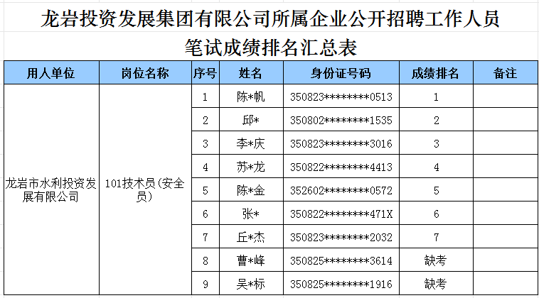 根據(jù)2024年12月12日發(fā)布的《龍巖投資發(fā)展集團(tuán)有限公司所屬企業(yè)關(guān)于公開招聘工作人員的公告》有關(guān)要求,現(xiàn)將龍巖市水利投資發(fā)展有限公司技術(shù)員(安全員)(崗位代碼101)筆試成績排名予以公示。